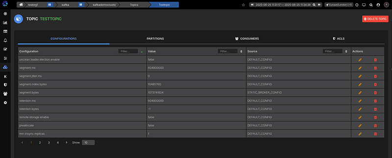 You can easily view topic configurations, with clear indicators showing whether a setting is using the default value or has been manually overridden. Each topic view also gives you deep visibility into partition details, associated consumer groups, and any ACLs that apply to that topic — all in one place.