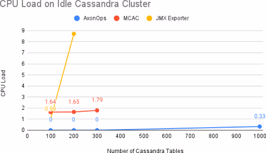 The majority of clusters typically have 100 tables or less. However, it is commonplace to have clusters with 1000 tables or more. I have personally worked in environments with these edge cases and being able to effectively monitor them with AxonOps is truly impressive. While this test is being run on nodes with 2 CPUs, the JMX Exporter may not be ideal for some enterprise-level configurations without proper performance testing.