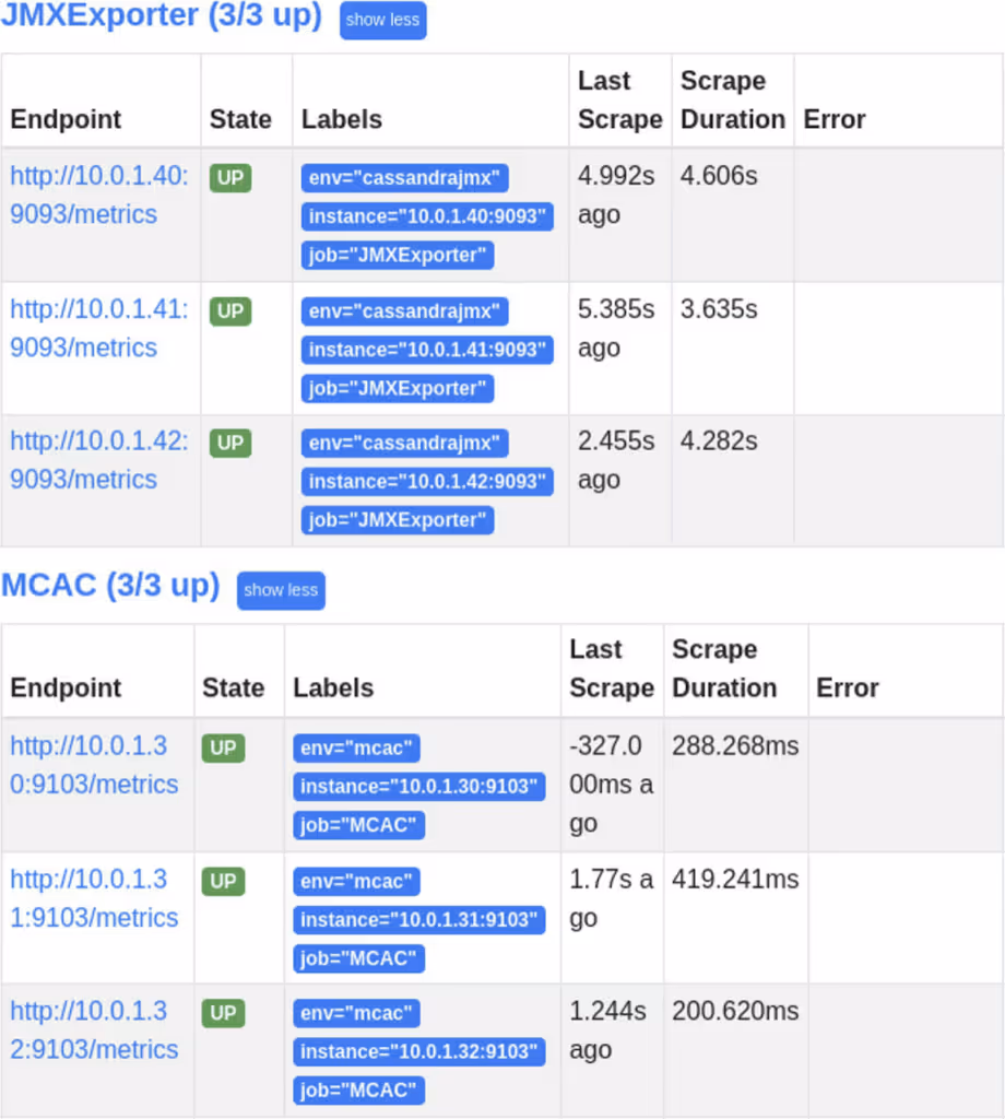 The MCAC exporter is noteworthy for having a surprisingly quick scrape time about 20 times faster than that of the JMX Exporter, due to the local cache MCAC uses.