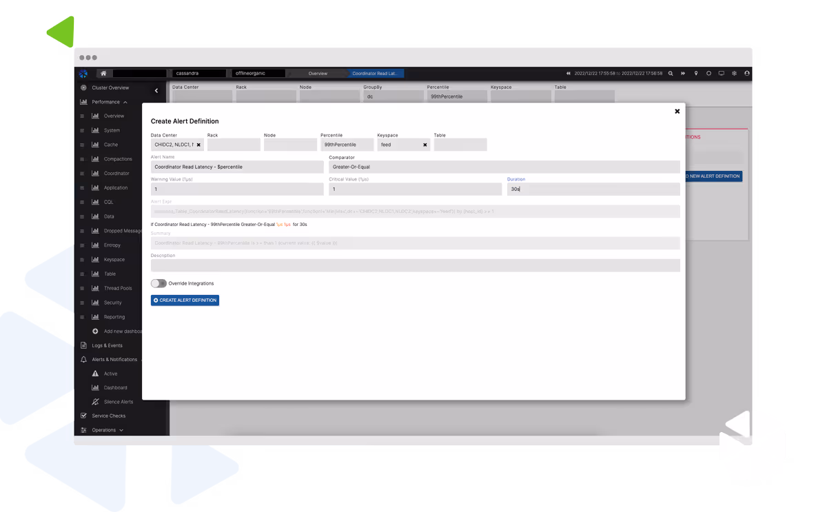 Establish alerts you need for every aspect of your Cassandra cluster aligned with Cassandra best practice and the demands of your business. Always put yourself in the path of preemptive maintenance and never miss something requiring your immediate attention.