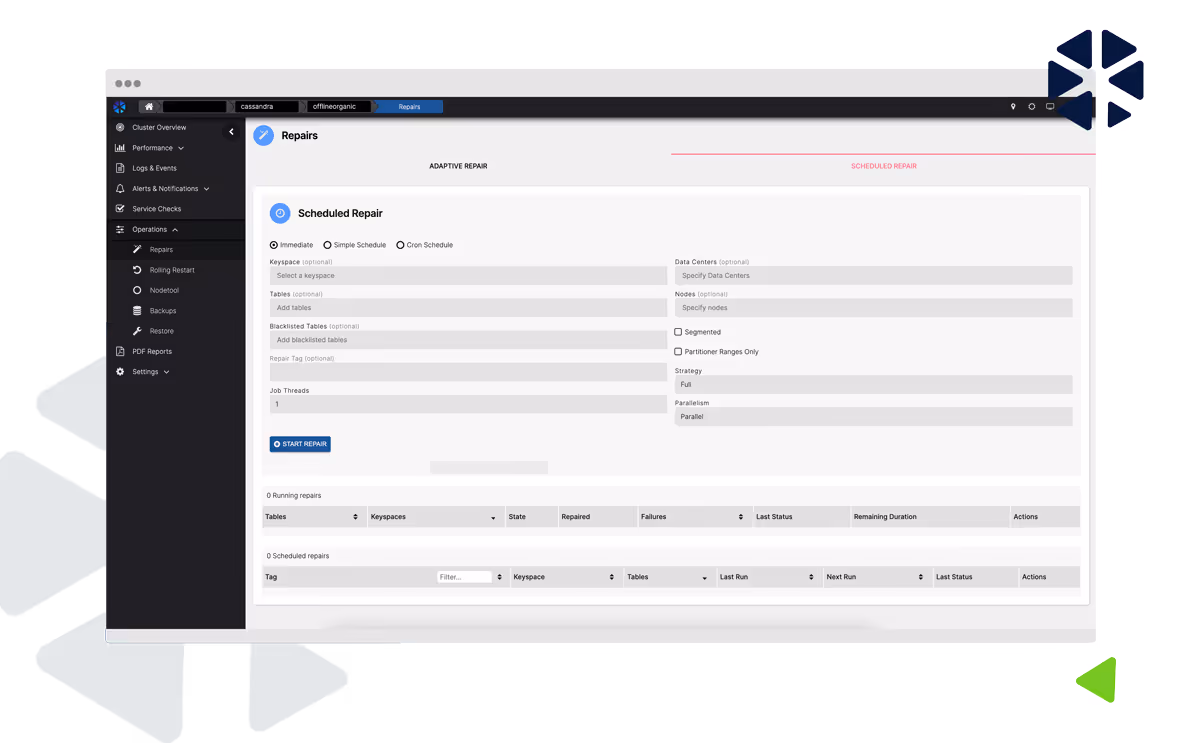 When you need to repair Cassandra for a specific operational scenario, no problem. Simply work within the intuitive UI to implement a repair job and run it now or schedule it for later. The perfect compliment to Adaptive Cassandra Repairs for those specific edge cases.